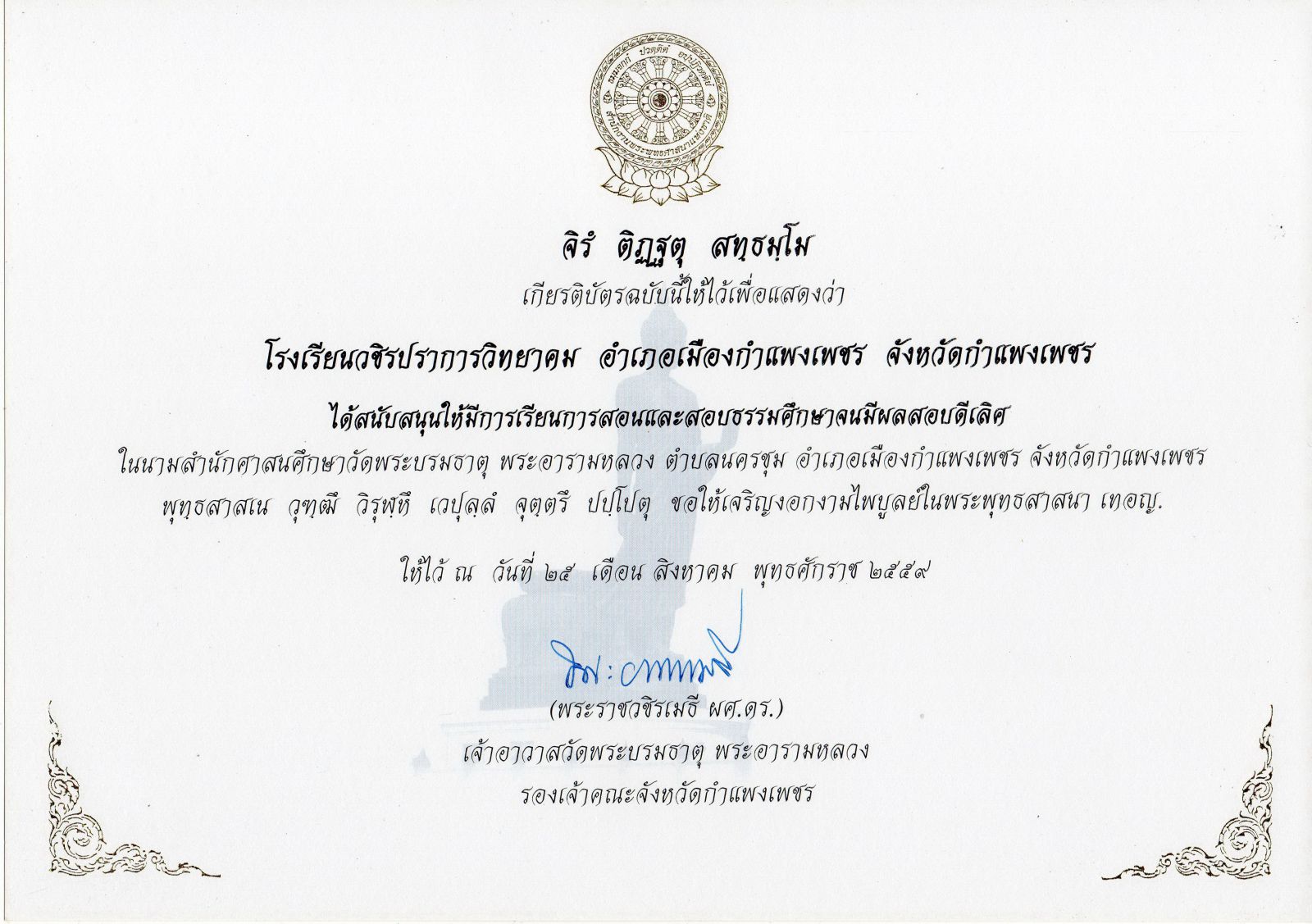 เกียรติบัตร ได้สนับสนุนให้มีการเรียนการสอนและสอบธรรมะศึกษาจนมีผลสอบดีเลิศ